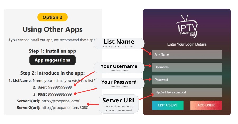 - Host/URL: Your provider’s server (ex: http://example.com:8080).